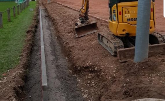 Am 11.11.2019 war es soweit. Es wurden die ersten Arbeiten am neuen Kunstrasen gestartet. Zuerst wurden seitlich zum Rasenplatz hin Randsteine gesetzt, damit dort dann gepflästert werden kann. Zudem wurde damit begonnen die Drainageleitungen zu verlegen. Erste Veränderungen kann man also schon sehen und wir freuen uns auf weitere… Kunstrasenplatz am Klotzen (veröffentlicht am Mi, 20. November 2019 auf badische-zeitung.de)