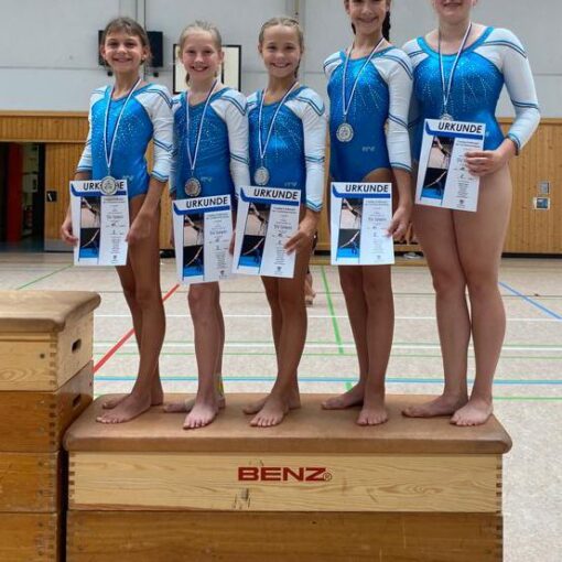 Die Bronzemedaille in der Altersklasse 16/17 Jahre und jünger erturnten sich Paula Bieg, Franziska Hofmann, Lilly Kuner und Timnah Kaufmann.